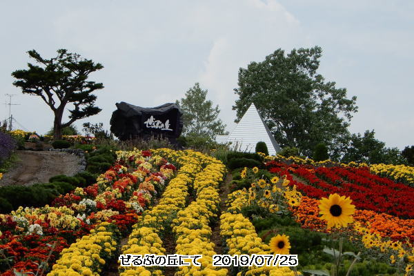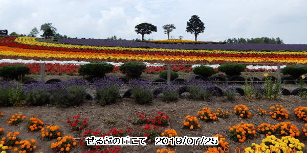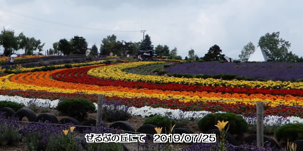 🌸 北竜町から南東へ約40キロ。札幌駅でバスに積んであった弁当を分けてもらって、車中で昼食。美瑛町の『ぜるぶの丘』に向かう。ここは国道237号線沿いに広がる花畑。なだらかな丘の頂中央に石碑が立ち、その周辺にラベンダー、マリーゴールド、ポピーを主とした色とりどりの花が、帯状に咲いている。