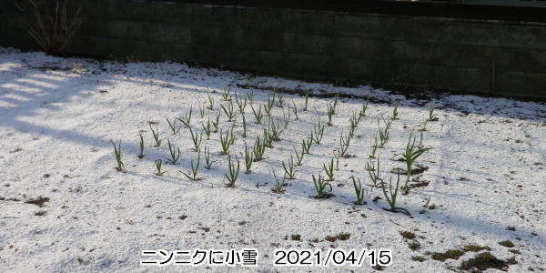 ⛄ 今朝早くに、さっと雪が積もった。昨日まで温かかったので、朝の冷気が身に染みた。冬の間の積雪に耐えていたニンニクが、今朝の小雪の上に健気に立っている。雪は、朝のうちにすぐ溶けてしまった。