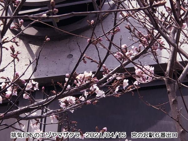 🌸 午前中、妻と宮の沢の病院に出かけ、最近すっかり有名になった早咲きの桜を見に行ってきた。宮の沢駅の6番出口のあるビルの南東面にある空調排気口の下で、エゾヤマザクラが咲いていた。これは新聞に、4月4日に第1輪が咲いたと掲載されていた。
