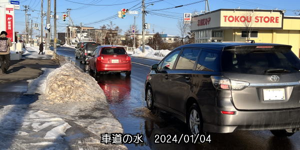 🌞 ここ数日、最高気温がプラスになり、車道の踏み固められた雪が解けてアスファルトが顔を出し、水が溜まっている。横断歩道では、自動車も水をはねないようにと、そろりそろりと運転している。一部には豪勢に水をはねていく車もあるが・・・。