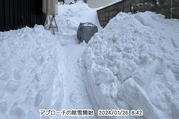 ⛄ 今冬の雪は、昨年末までは大したことはなかったものの、年が明けてからは結構降り積もった。札幌気象台の記録でも、初雪から始まって今日までの延べ降雪量は224cm、また今日現在の積雪量は73cmになっている。8時過ぎにまず玄関から道路と融雪機の間に積もった雪を運ぶため1本のルートを作った。このルートでアプローチの雪を運ぶ。