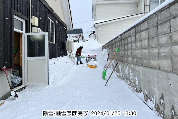 ⛄ 妻と二人で作業をしており、私が積み込み・移動を担当、妻が融雪機への投入を担当しているが、さすがに2人とも疲れが出て、1時間半ほど昼食休憩をとって、処理を完了したのは14時ちかくになった。