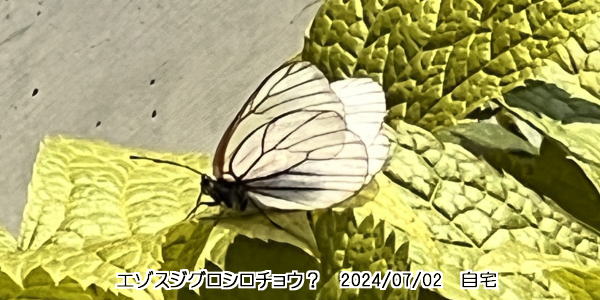 🦋 少し落ち着いていろいろの方向から撮影するとよかったのだが、宅配便の女性を待たせていたので、同じ方向から2枚ほど撮っただけだった。こ写真から見ると、どうやら「エゾスジグロシロチョウ」かと思われる。