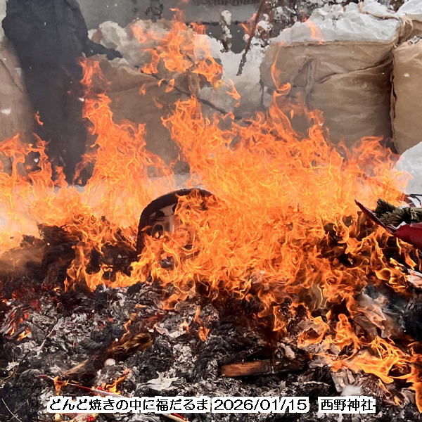 ※ きょうは西野神社でどんど焼きがあった。私達は昨年の破魔矢とお札を早めに預かり所に預けておいたが、きょう持ってきて係の人に預ける人たちも多かった。中には、大きな福ダルマを持参した人もいて、係の人が炎の中央に投げ入れていた。