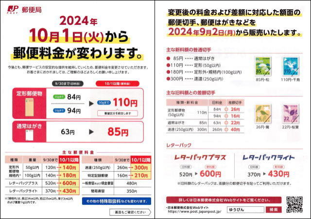 ※ 11月1日から郵便料金がまた値上げになるという。私が社会人になった1967年には、ハガキ1枚が7円だった。その後物価の値上げ、郵政民営化を経て、最近の円安ドル高の刺激によって都合10回目の値上げになった。あれから57年。ハガキ1枚が12倍強の85円になる。