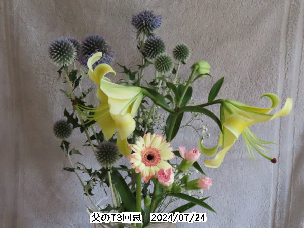 🌺 今年は、庭で咲いたカサブランカ系の黄色のユリに、生花店で求めた花を添えた。父が亡くなったのは42歳だった。手稲山の頂上に警察無線用の鉄塔建設の指揮を取り、その完成直後に、小樽市のオタネ浜での海難救助訓練の指導中に、水温の急激な低下によって心筋梗塞を発症し、近くにいた医師の処置も叶わず、還らぬ人となった。