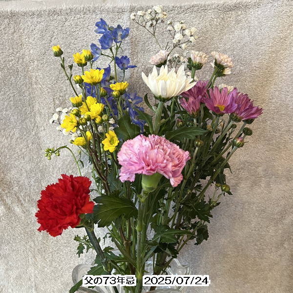 🌺 早いもので、私が10才の時に父が亡くなって今日で満72年になった。仏教でいうと73回忌に当たるのだという。妻と、スーパーマーケットの生花コーナーで変わった花を求めて、自宅の花瓶に飾った。名も知らぬ花だが、毎年命日には何らかの花を飾る。