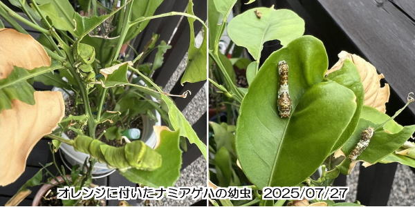 🦋 5年ほど前にカリフォルニアオレンジを食べた際、いたずらに鉢に蒔いた種が芽を出して、今年は鉢土から高さ50センチほどになった。やや大きめの葉をつけていたが、7月中旬を過ぎるとナミアゲハが産卵したらしく、6頭の幼虫が着いていて、5齢が3頭、4齢が3頭いて、オレンジの葉をかなり食べていた。