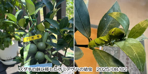 ※ 8月9日、それぞれの幼虫はスダチの葉を食べてはいたが、全て死んでしまった。何が要因だったのかは分からない。スダチは合わなかったのか? Googleで『ナミアゲハの幼虫の食草』で検索しても、スダチを含む柑橘系( ミカン、オレンジ、スダチ、レモン、サンショウ )の葉と書いてあるのだが・・・。原因は分からない。悲しかった。